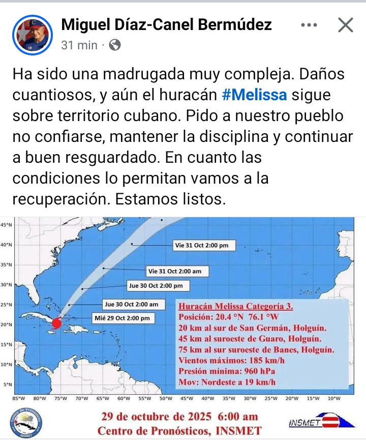Díaz-Canel afirmó que el país está listo para comenzar la recuperación en cuanto las condiciones lo permitan. «Ha sido una madrugada muy compleja. Daños cuantiosos, y aún el huracán #Melisa sigue sobre territorio cubano. Pido a nuestro pueblo no confiarse, mantener la disciplina y continuar a buen resguardado. En cuanto las condiciones lo permitan vamos a la recuperación. Estamos listos». El Instituto cubano de Meteorología informó en el más reciente Aviso de Ciclón Tropical que en las próximas 12 a 24 horas se espera que el huracán Melissa siga debilitándose ligeramente en su interacción con tierra, mientras continúa moviéndose con un rumbo próximo al nordeste y similar velocidad de traslación. Los vientos huracanados continuarán sobre Santiago de Cuba y Holguín durante la mañana de hoy y las áreas de lluvias asociadas a este huracán afectan la región oriental de Cuba, las que han llegado a ser fuertes e intensas en algunas localidades. Radares meteorológicos estimaron pasadas las 7:00 a. m. que el huracán Melissa saldría del territorio nacional por Guaro, en la bahía de Nipe, provincia de Holguín.