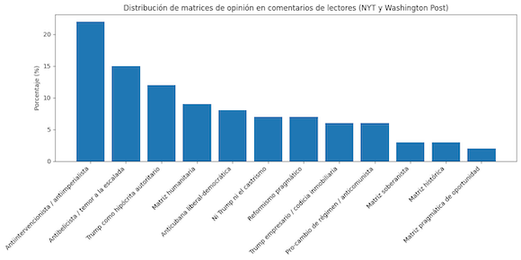 Conviene subrayar, no obstante, un límite metodológico: no se trata de una muestra representativa de toda la sociedad estadounidense, sino de un corpus específico de comentarios en dos medios concretos. Aun así, el ejercicio está realizado con criterios sistemáticos de observación y clasificación, y resulta suficientemente sólido para demostrar el punto central de este trabajo: la conversación visible en redes no equivale, por sí misma, a la opinión pública realmente existente.
