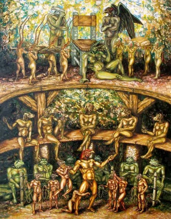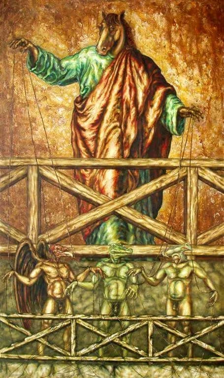 Quizás por ello se hace visible en cada representación estética la construcción e identificación del hombre-perro, hombre-caballo, hombre-iguana, hombre-gato, hombre-asno y hombre-pájaro etc. con el fin de homologar cada uno de nuestros comportamientos, ya sea desde lo físico, psicológico y existencial para detonar la siguiente pregunta ¿cuánto de perro y gallo tenemos?, ¿cuánto de asno o caballos? o ¿cuánto de camaleón, gato, cerdo y cocodrilo tenemos cada una de las situaciones que se nos presenta en la vida?, tal como se aprecia en la obra: Ni público ni orquesta, de la serie Hasta cuando, experimentación gráfica, 70 x 50 cm, 2023 y Se formó, de la serie El culto a Príapo, acrílico sobre lienzo, 140 x 400 cm, 2013.