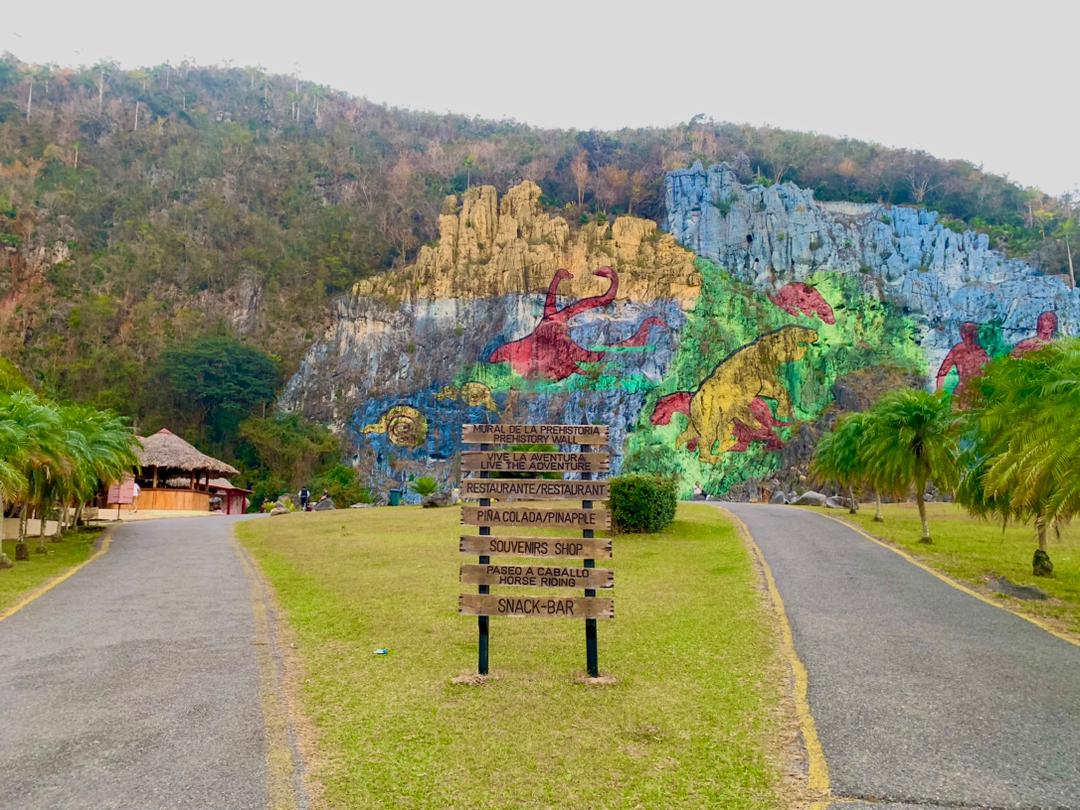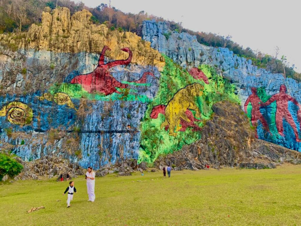 El Mural de la Prehistoria, ubicado en el valle de Viñales, es una de las pinturas a cielo abierto más grandes del mundo. Con dimensiones de 80 metros de altura por 120 metros de longitud, la obra funciona como una cronología visual de la evolución biológica y geológica del archipiélago cubano.