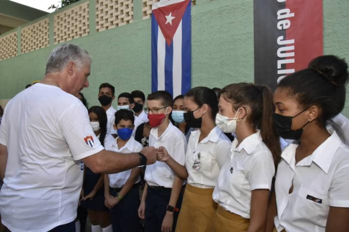 Hasta la secundaria básica Frank País, sometida a una reparación capital llegó luego el Presidente. En la institución educativa recorrió las nuevas aulas, laboratorios y otros locales, y compartió con alumnos y profesores, visiblemente emocionados por contar con una nueva escuela y el diálogo con el Primer Secretario del Comité Central del Partido.